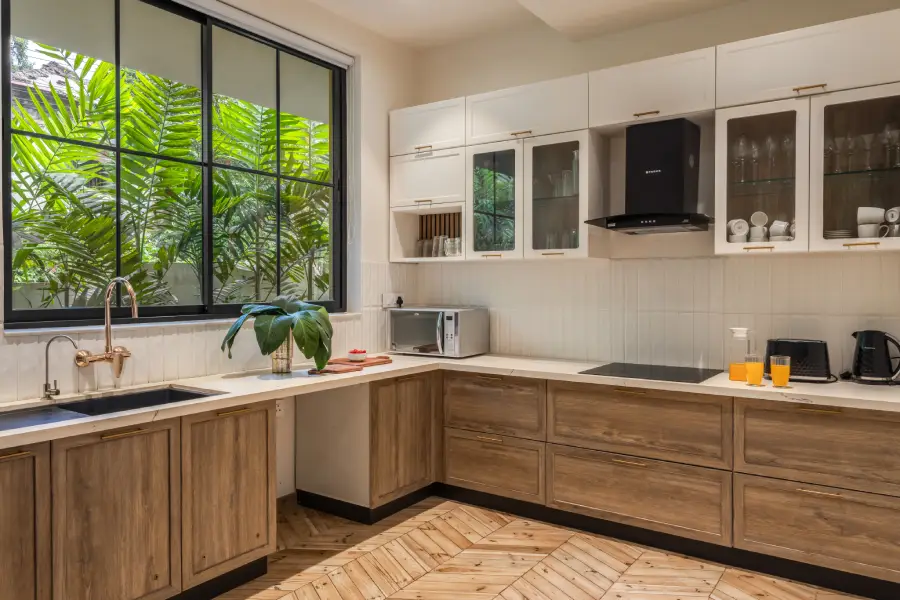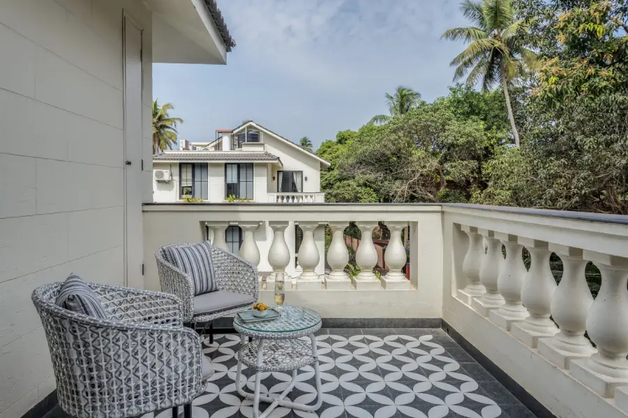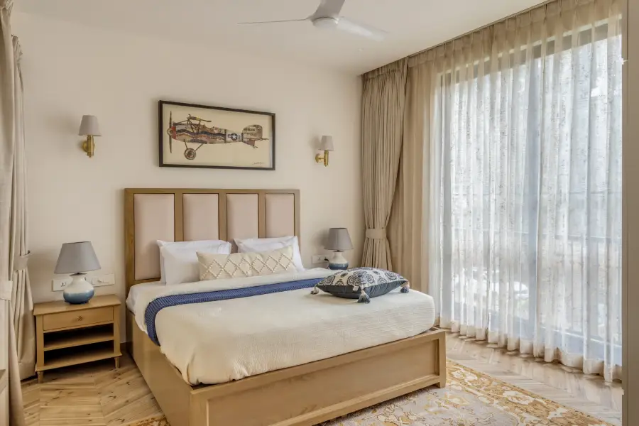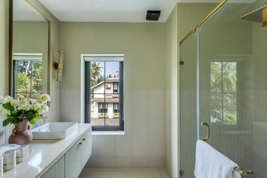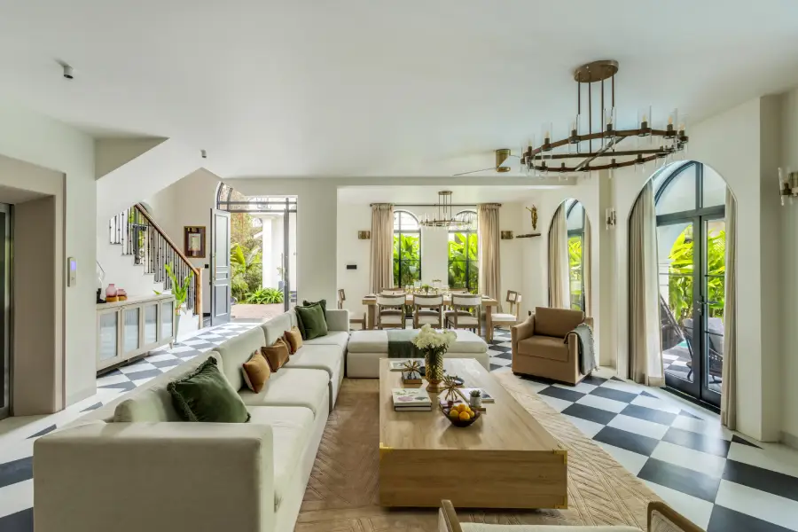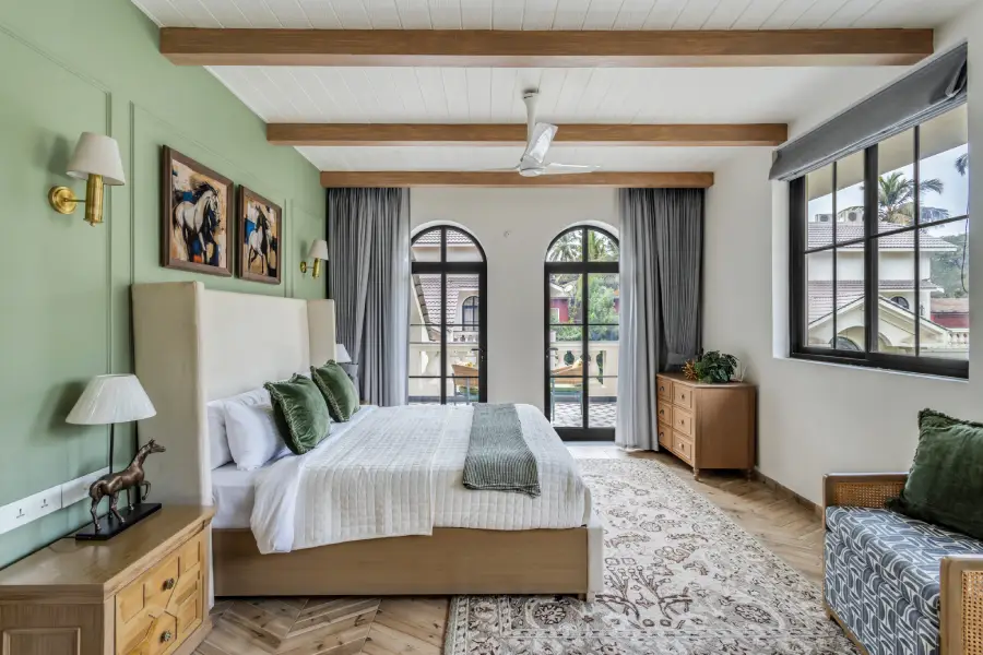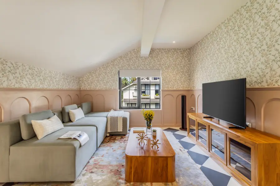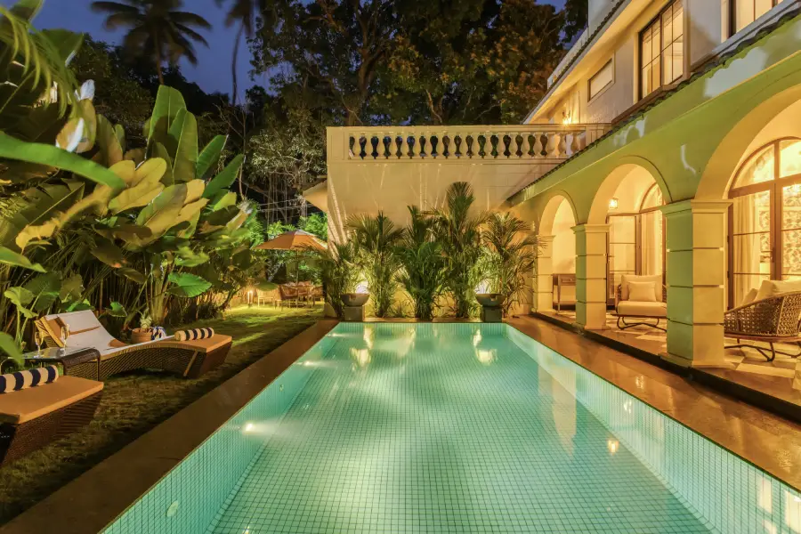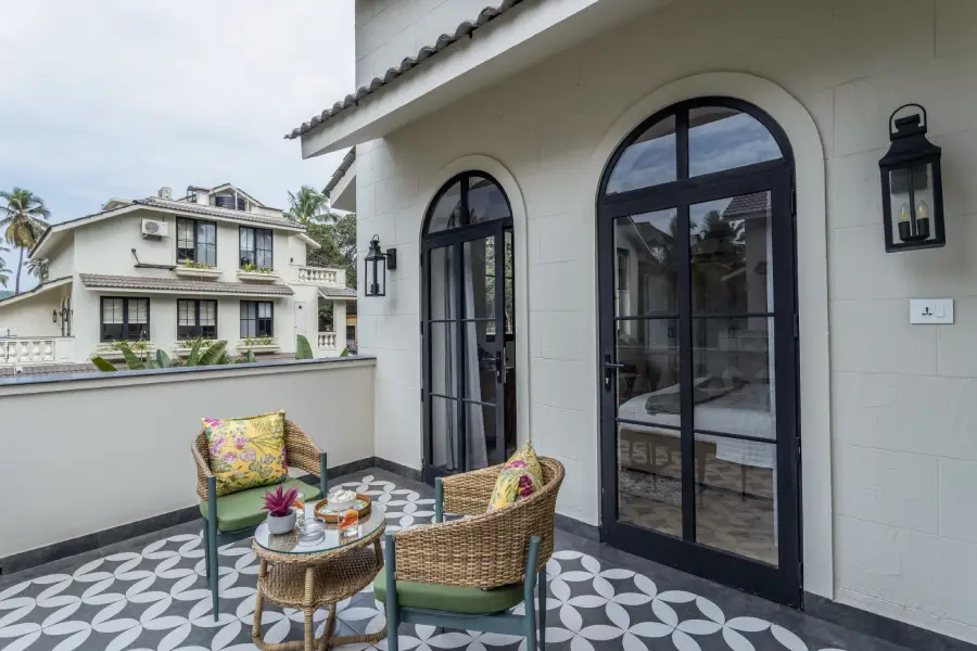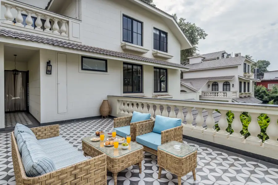 4Echo Villa, Arpora offers beautifully designed 4BHK villas spread across Ground + 2 floors, perfect for comfortable group stays in a prime location. The ground floor features a stylish living and dining area facing the pool, a powder room, and a fully equipped kitchen with oven, fridge, and induction. Bedrooms are on the upper floors with two on the first floor and a spacious master bedroom on the second floor (4BHK includes a larger 29×20 ft master suite with private seating). All villas have queen beds, selected rooms with balconies overlooking the pool, and no bathtubs. Enjoy a private pool, small garden area, shaded seating space, and sunbeds for relaxation. TV setups vary — Villa 3 has 1 TV, Villas 2 & 5 have 4 TVs each, and Villa 4 has 2 TVs. A perfect blend of space, comfort, and privacy in the heart of Arpora — welcome to Echo Villa.