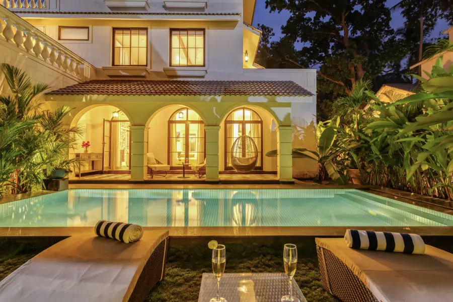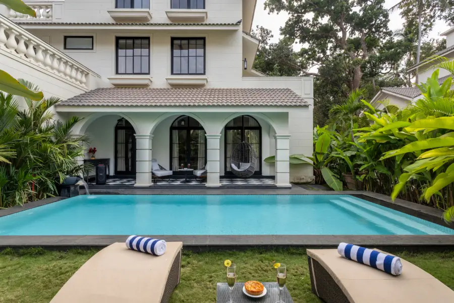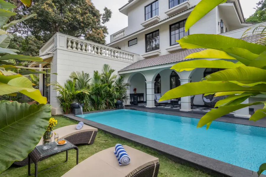 4Echo Villa, Arpora offers beautifully designed 4BHK villas spread across Ground + 2 floors, perfect for comfortable group stays in a prime location. The ground floor features a stylish living and dining area facing the pool, a powder room, and a fully equipped kitchen with oven, fridge, and induction. Bedrooms are on the upper floors with two on the first floor and a spacious master bedroom on the second floor (4BHK includes a larger 29×20 ft master suite with private seating). All villas have queen beds, selected rooms with balconies overlooking the pool, and no bathtubs. Enjoy a private pool, small garden area, shaded seating space, and sunbeds for relaxation. TV setups vary — Villa 3 has 1 TV, Villas 2 & 5 have 4 TVs each, and Villa 4 has 2 TVs. A perfect blend of space, comfort, and privacy in the heart of Arpora — welcome to Echo Villa.